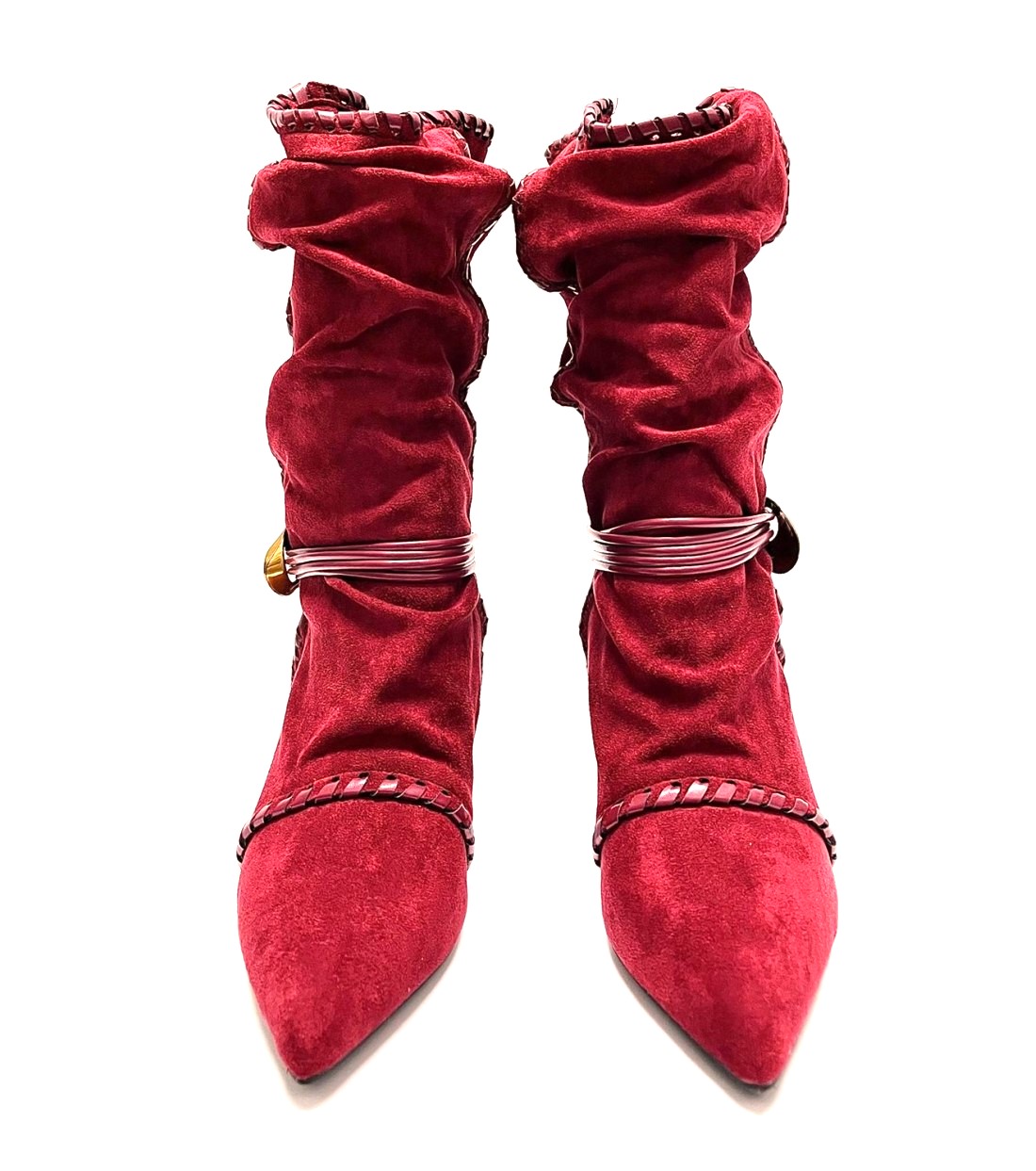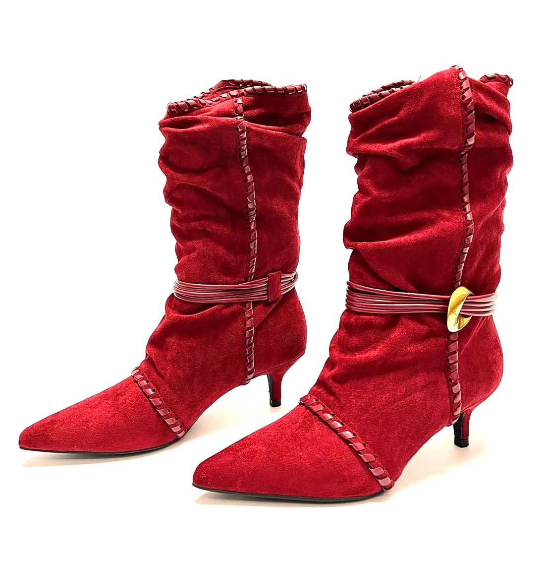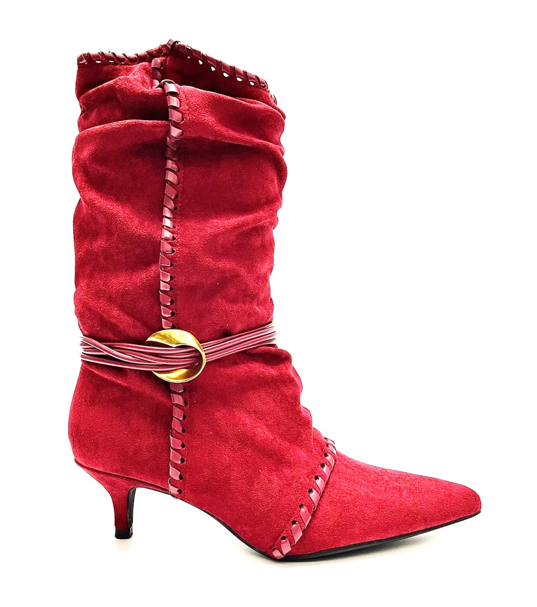 Bota Fabricada en Antelina, Forro en tejido, Planta Acolchada y detalle de Costuras en Polipiel en Pala y Caña y Adorno de Metal en la caña, Tacón 5 cm y la Caña 25cm.