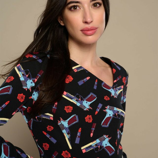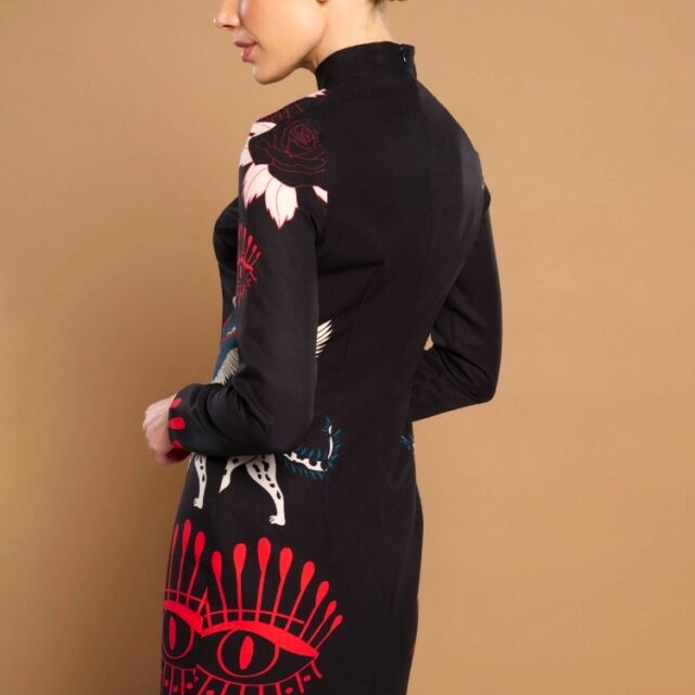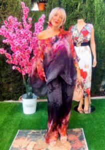 Conjunto compuesto de Blusón y Pantalón, Estampado en Tejido de Seda Estampado. Cuello acabado en Redondo tipo Barco, Mangas Largas y Anchas.