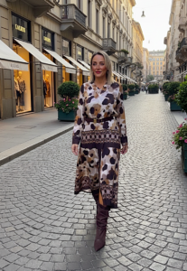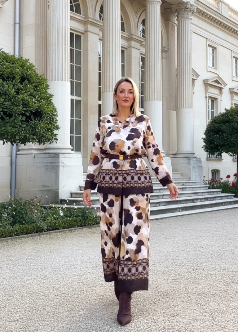 Conjunto Compuesto de Falda corte tipo Midi con abertura delantera y Blusón a juego con detalles de Estampados AnimalPrint, Manga larga y Cuello Acabado en Pico.