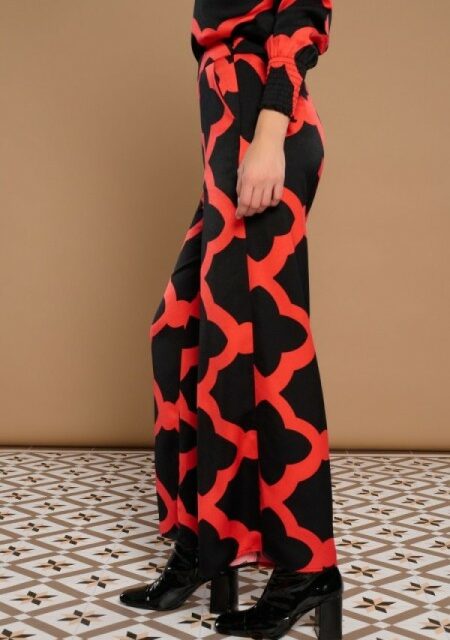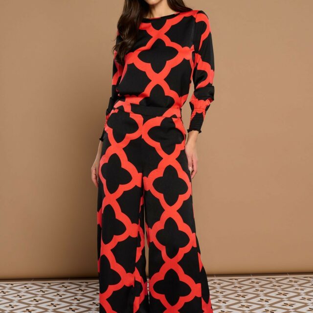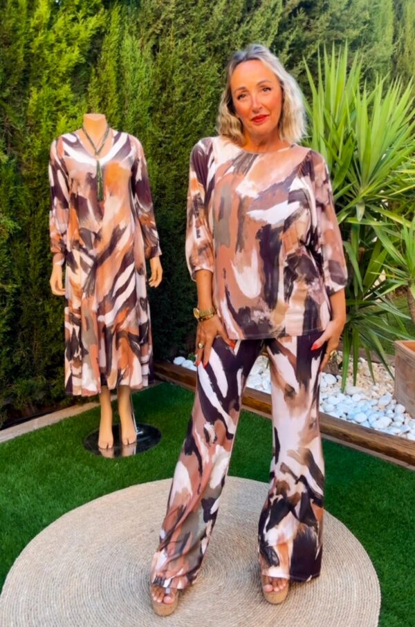 Conjunto Compuesto de Pantalón y Blusón Estampado con detalles de Colores Naturales, Manga larga y Cuello Acabado en Redondo.