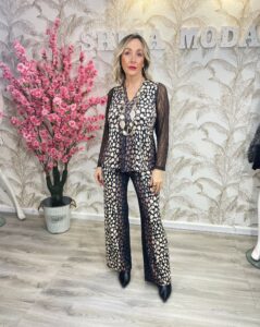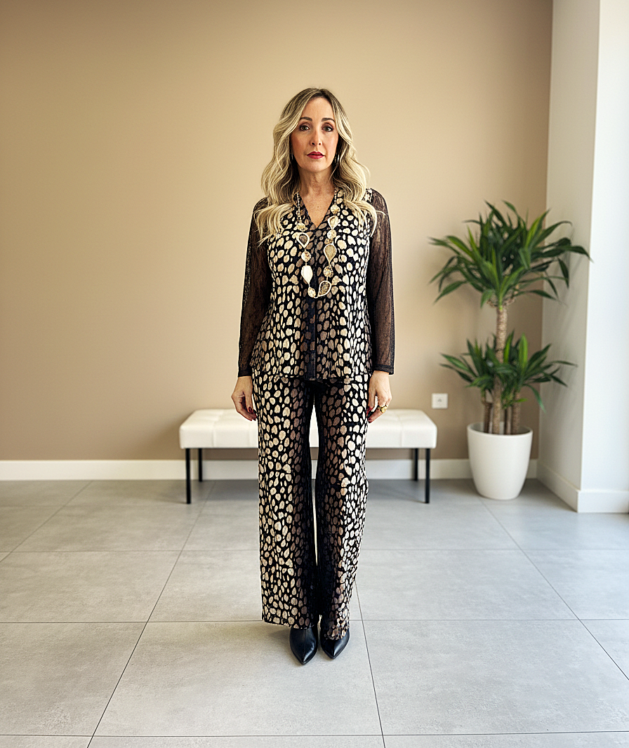 Conjunto Compuesto de Pantalón y Blusón a juego con detalles de Estampados AnimalPrint, Manga larga en tejido de encaje y Cuello Acabado en Pico.
