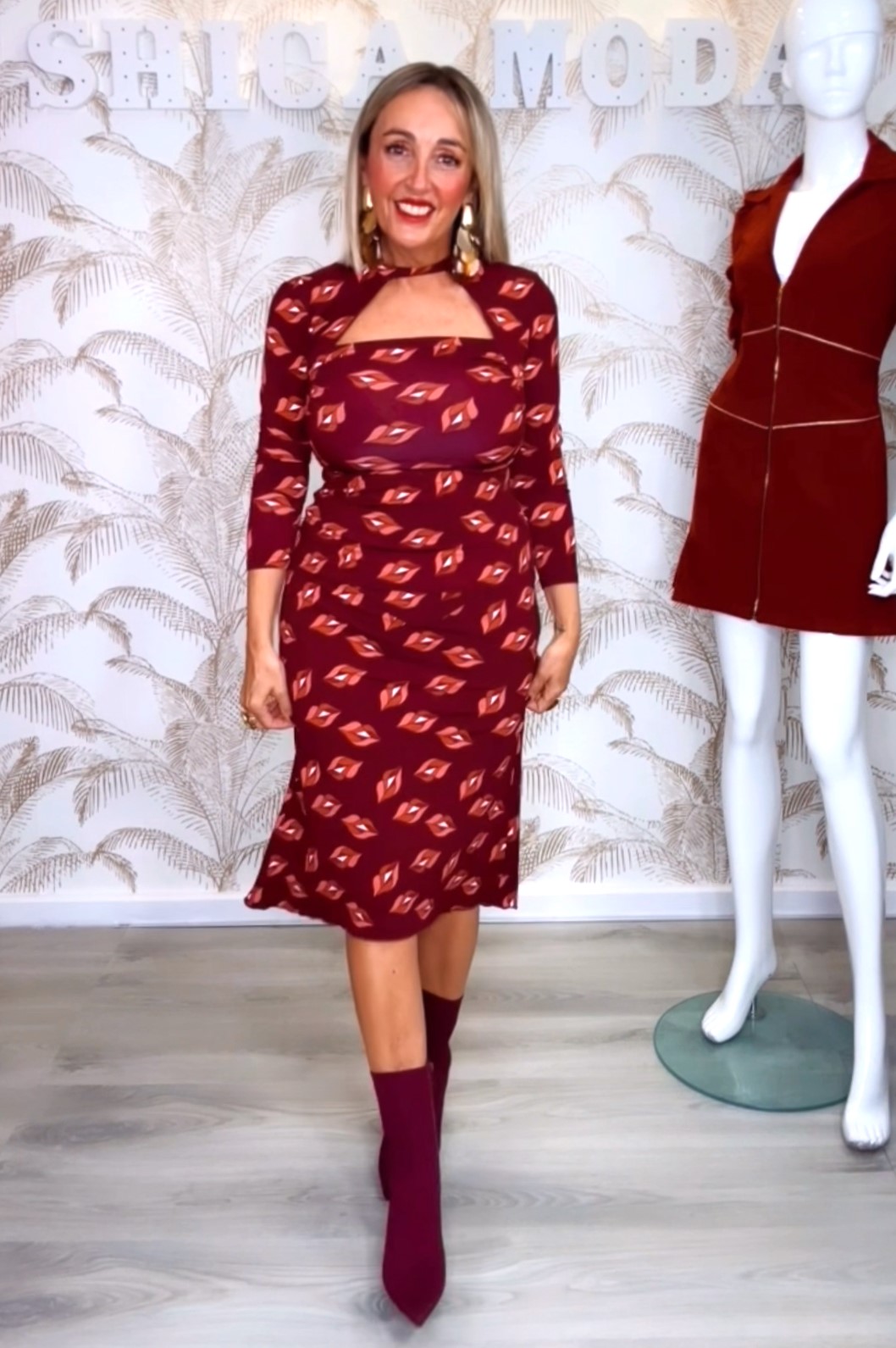 Conjunto Compuesto de Top con cuello redondo estilo Choker y abertura frontal en escote. Manga larga, Tejido elástico Estampado de Labios y de Falda Tipo Midi Elástica, Estampada de labios, Cierre con cremallera lateral izquierda oculta en costura.