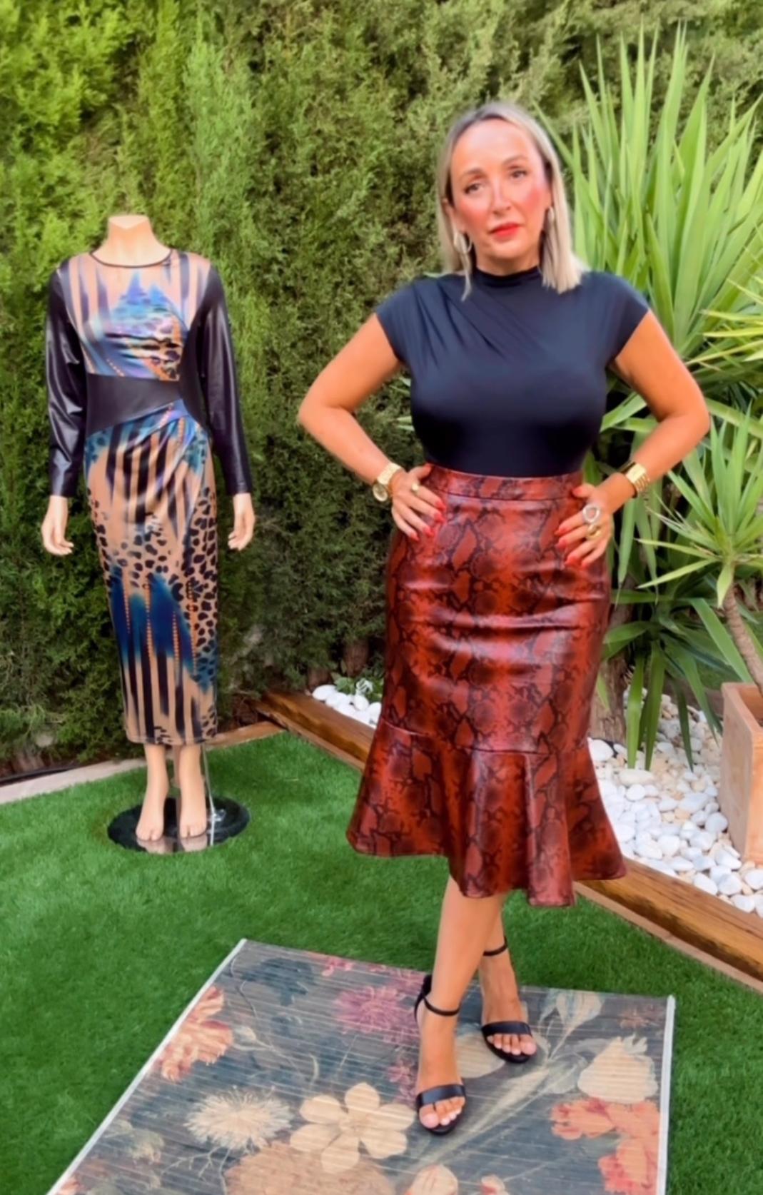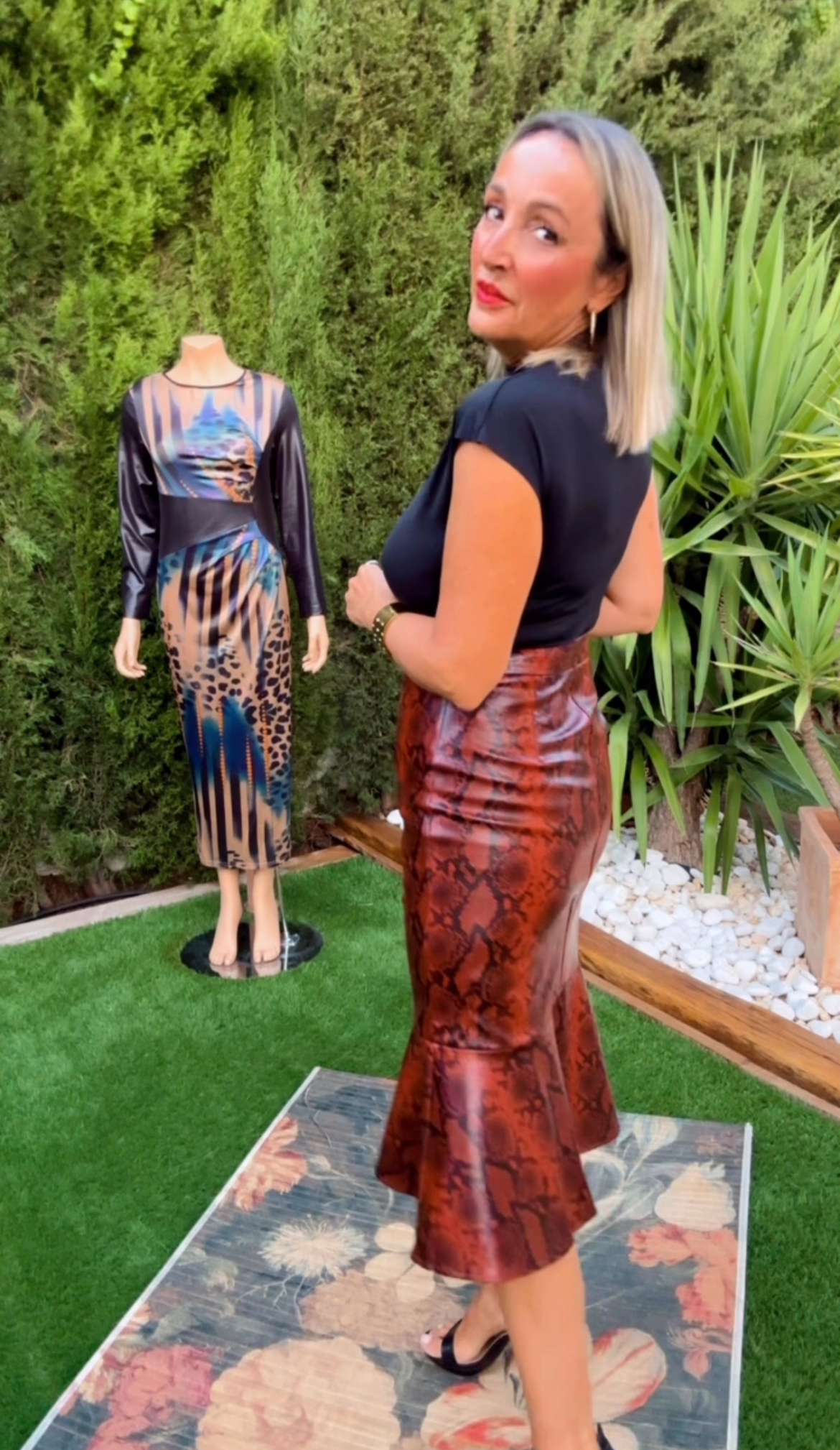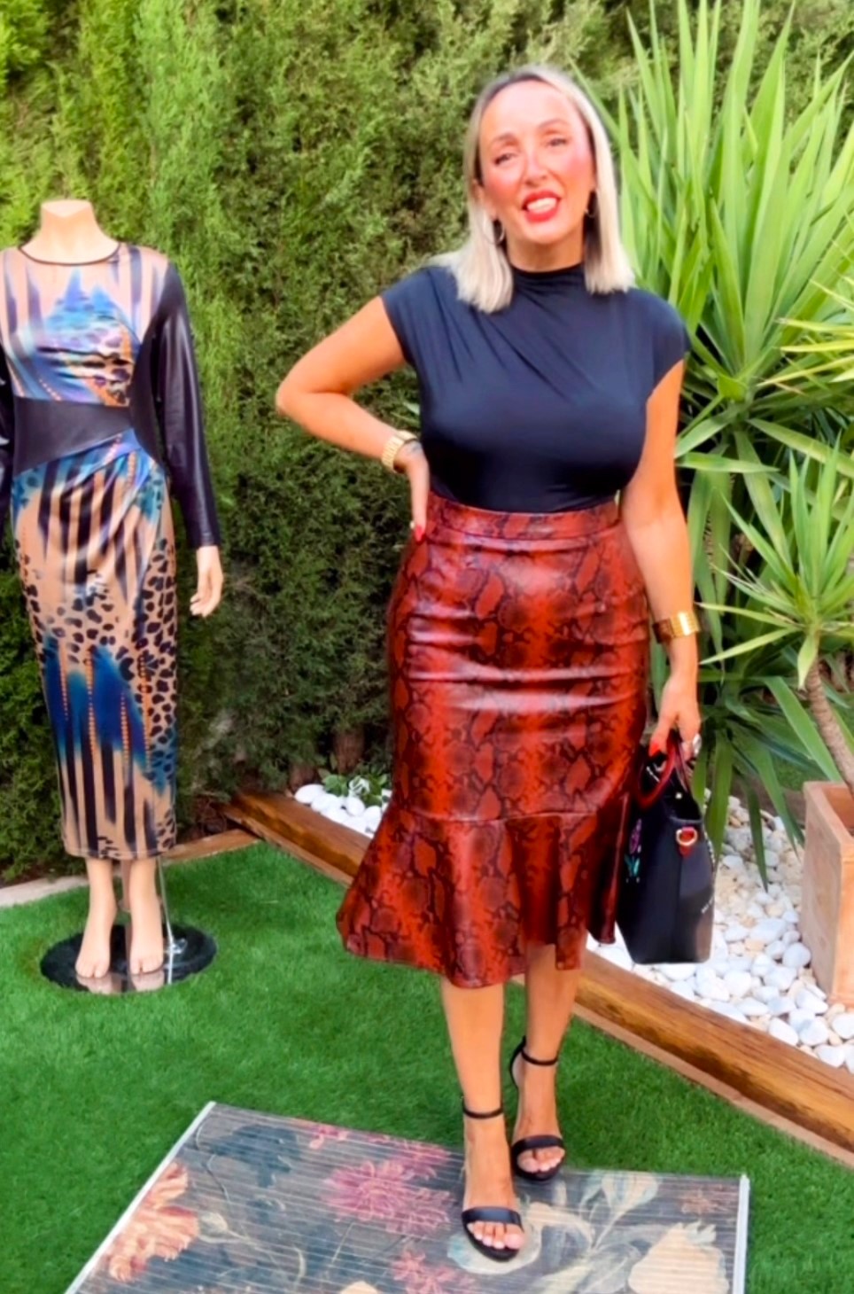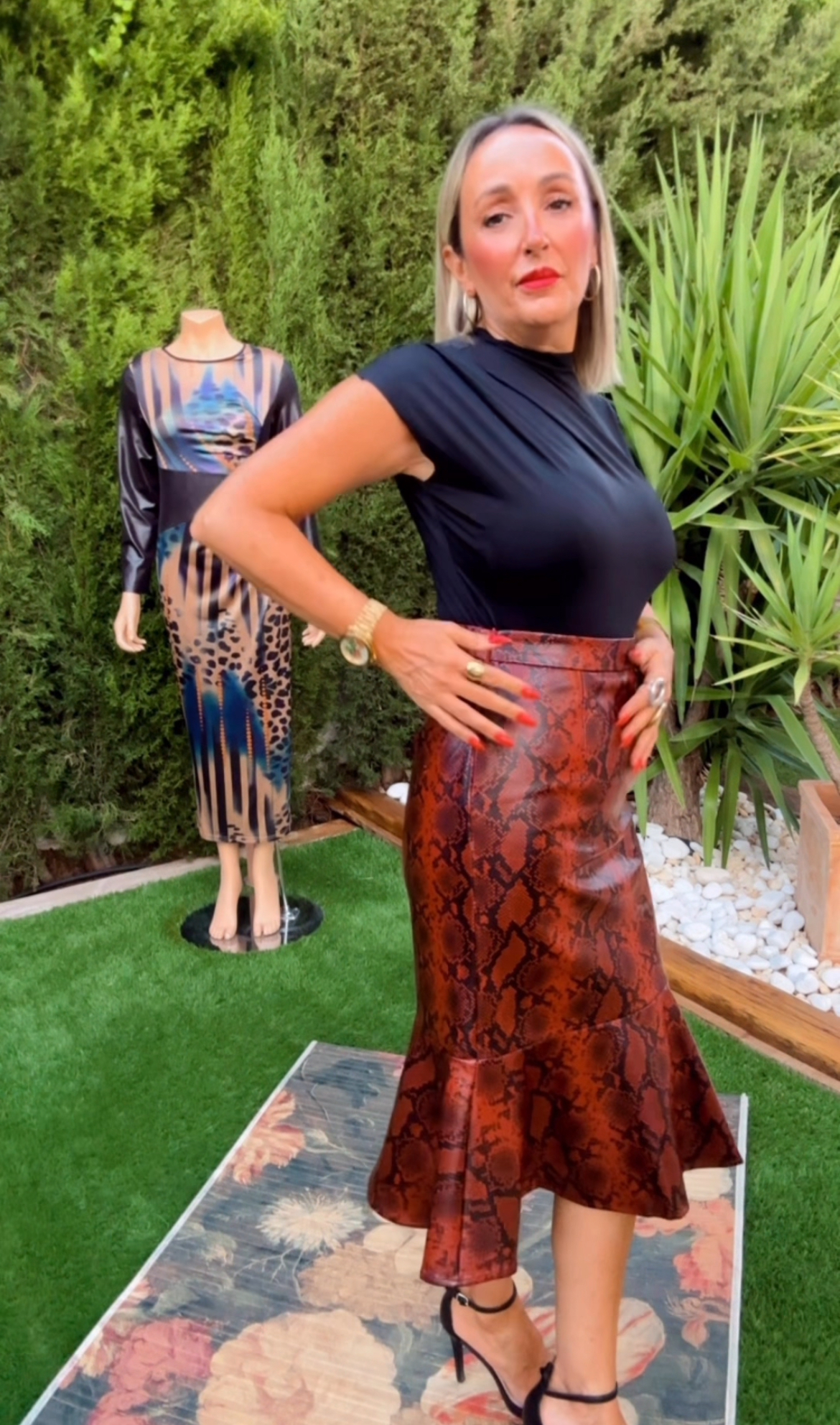 Falda Original en Polipiel con estampado de Serpiente en color Negro con fondo en color Rojo, corte tipo Midi, para ir a un Evento y Destacar. La Falda perfecta para una Celebración Especial y sentirte Observada.