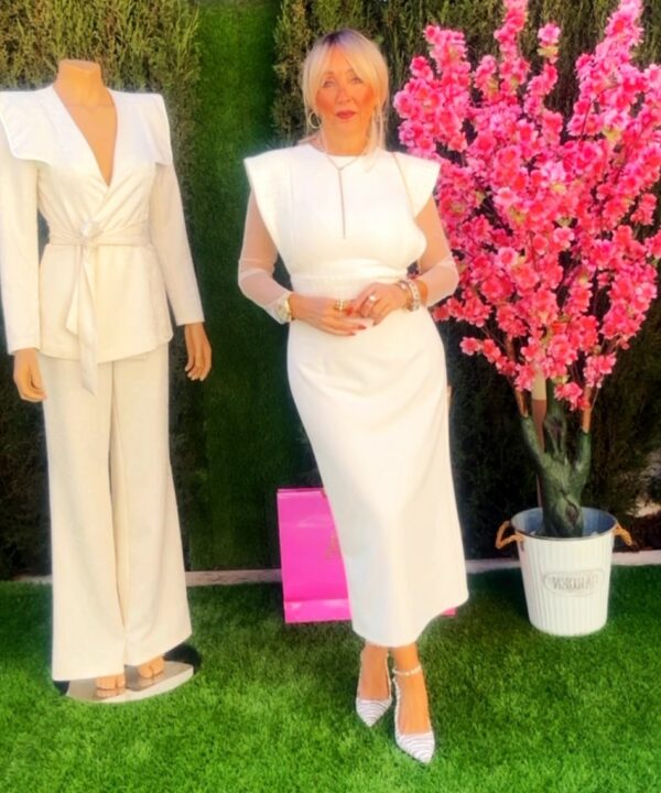 Vestido perfecto para Invitada o Mama de Comunión. Confeccionado en tejido Bioelástico combinado con Chanel. Solapas laterales y Cintura con Contraste. Detalles de manga en Tull. Cremallera invisible en Espalda. Lleva forro Interior.
