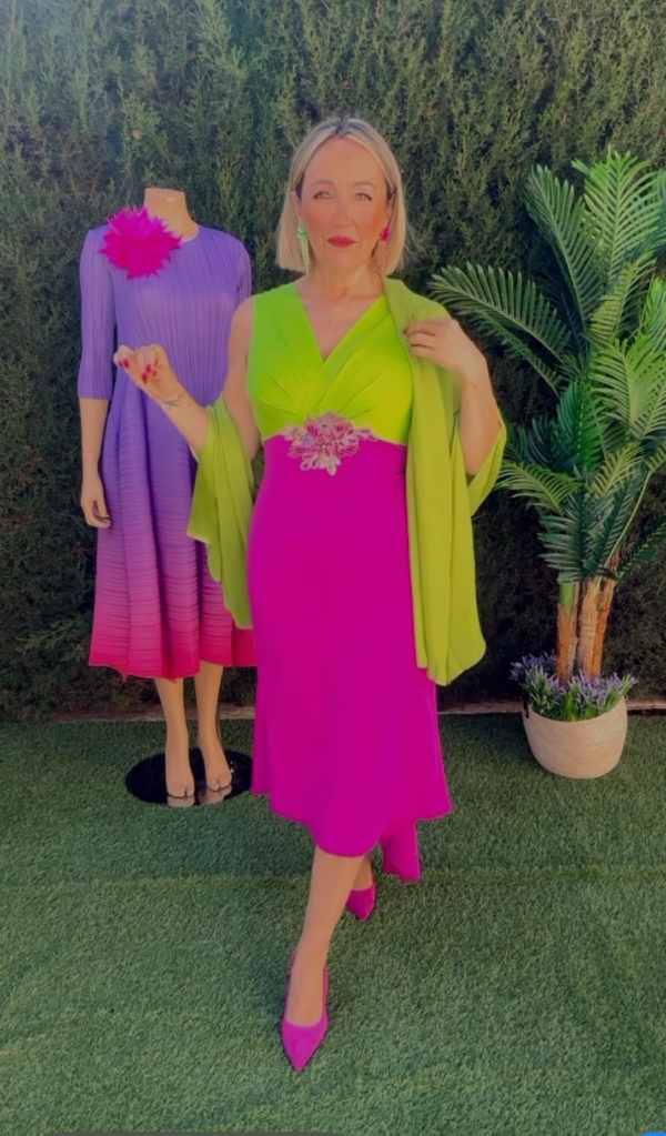 Vestido corte ideal para invitada perfecta de boda o comunión, en tejido Liso Bicolor, Escote tipo Pico, Mangas a la sisa y Adorno en cintura de flor bordada, Falda tipo midi.