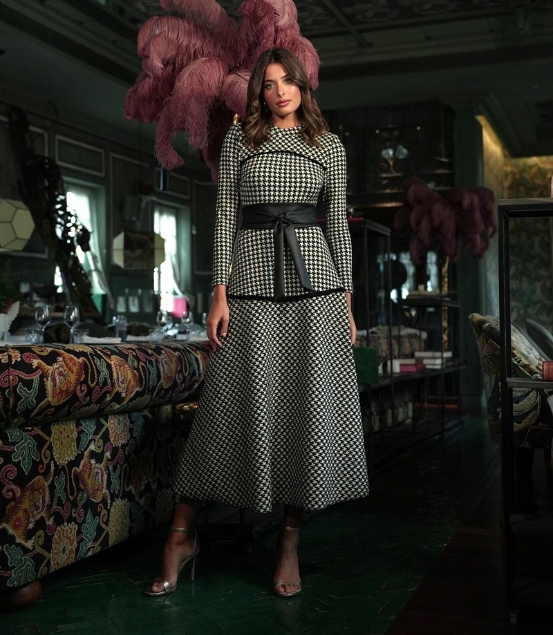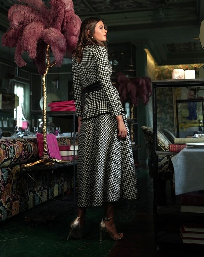 Este vestido de invitada midi está confeccionado en un tejido de punto grueso elástico con estampado en pata de gallo. El fajín satinado marca la cintura aportando estructura y un toque de distinción, mientras que la falda larga aporta movimiento y equilibrio visual. Detalle vivo flecos. Cierre cremallera invisible en espalda.