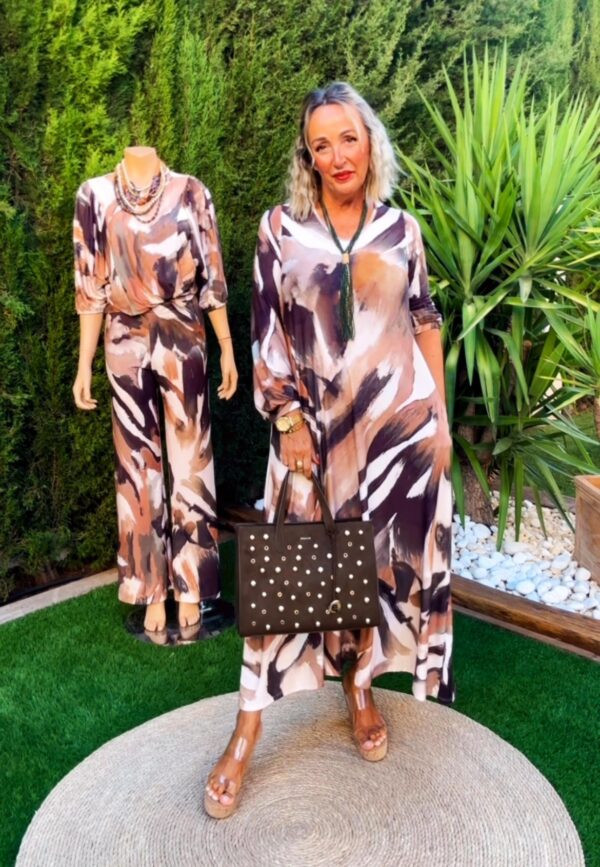 Vestido Estampado con detalles de Colores Naturales, Manga larga y Cuello Acabado en Redondo.