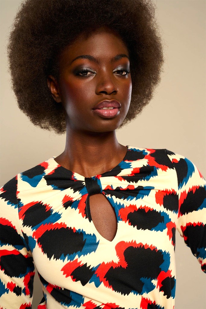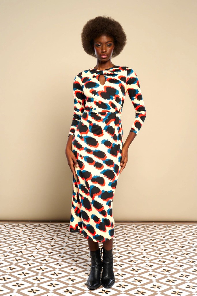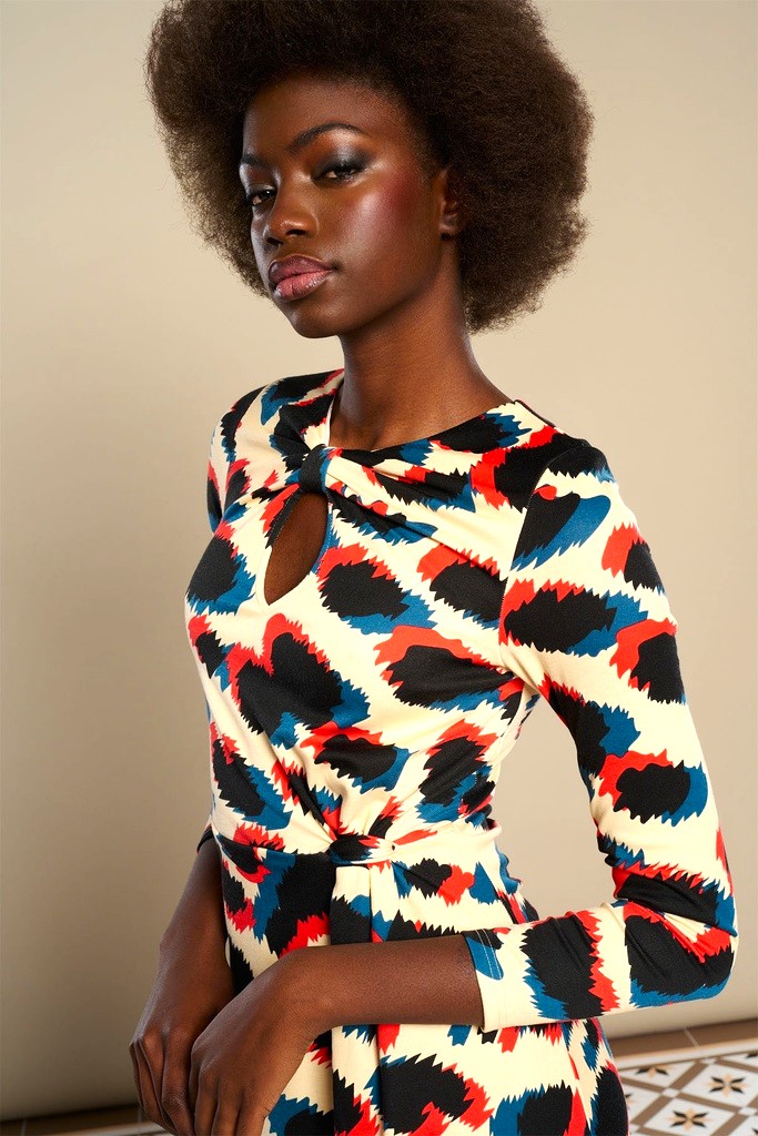 Vestido Midi de cuello redondo y Escoute Cutout. Manga larga. Ajustado en Cintura. Forro interior. Cierre en Espalda con Cremallera oculta en Costura.
