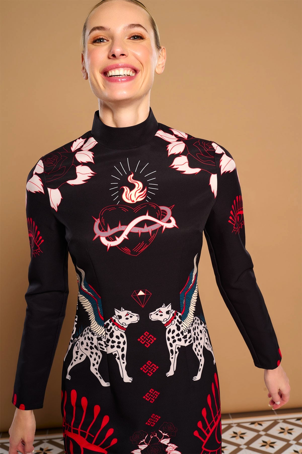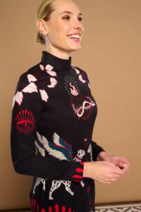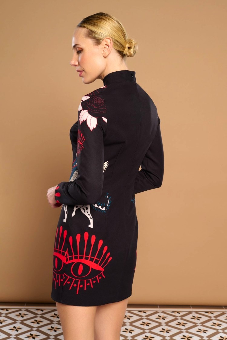 Vestido de cuello perkins y manga larga. Estampado místico. Forro interior. Cierre con cremallera oculta en costura.