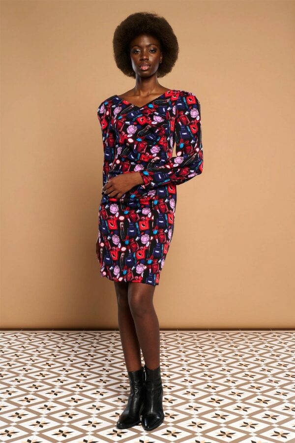 Vestido con escote con nudo cut-out y manga larga. Fruncido frontal. Falda de volantes. Tejido elástico. Estampado de labios.