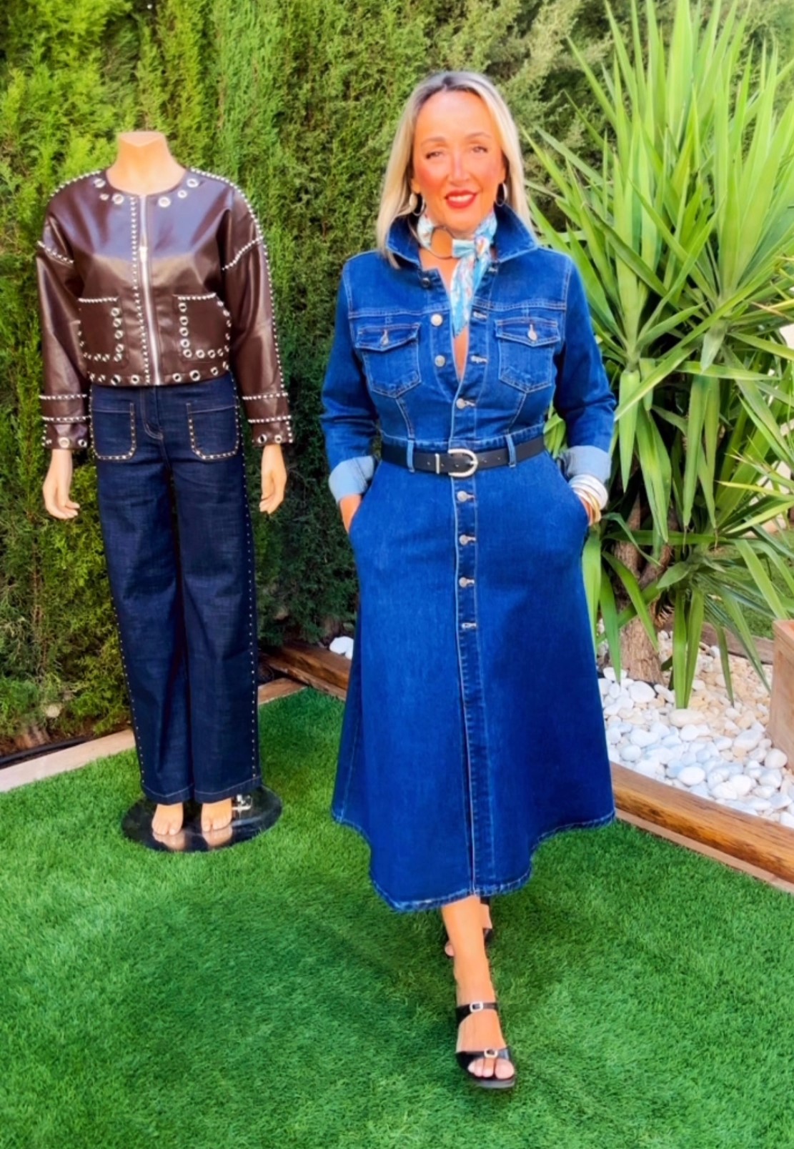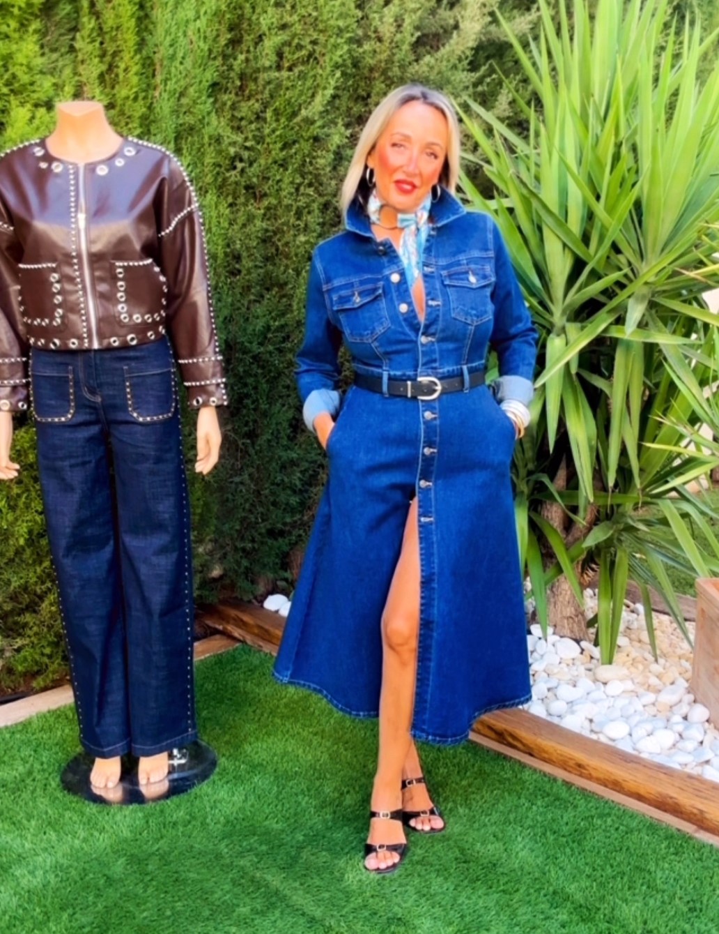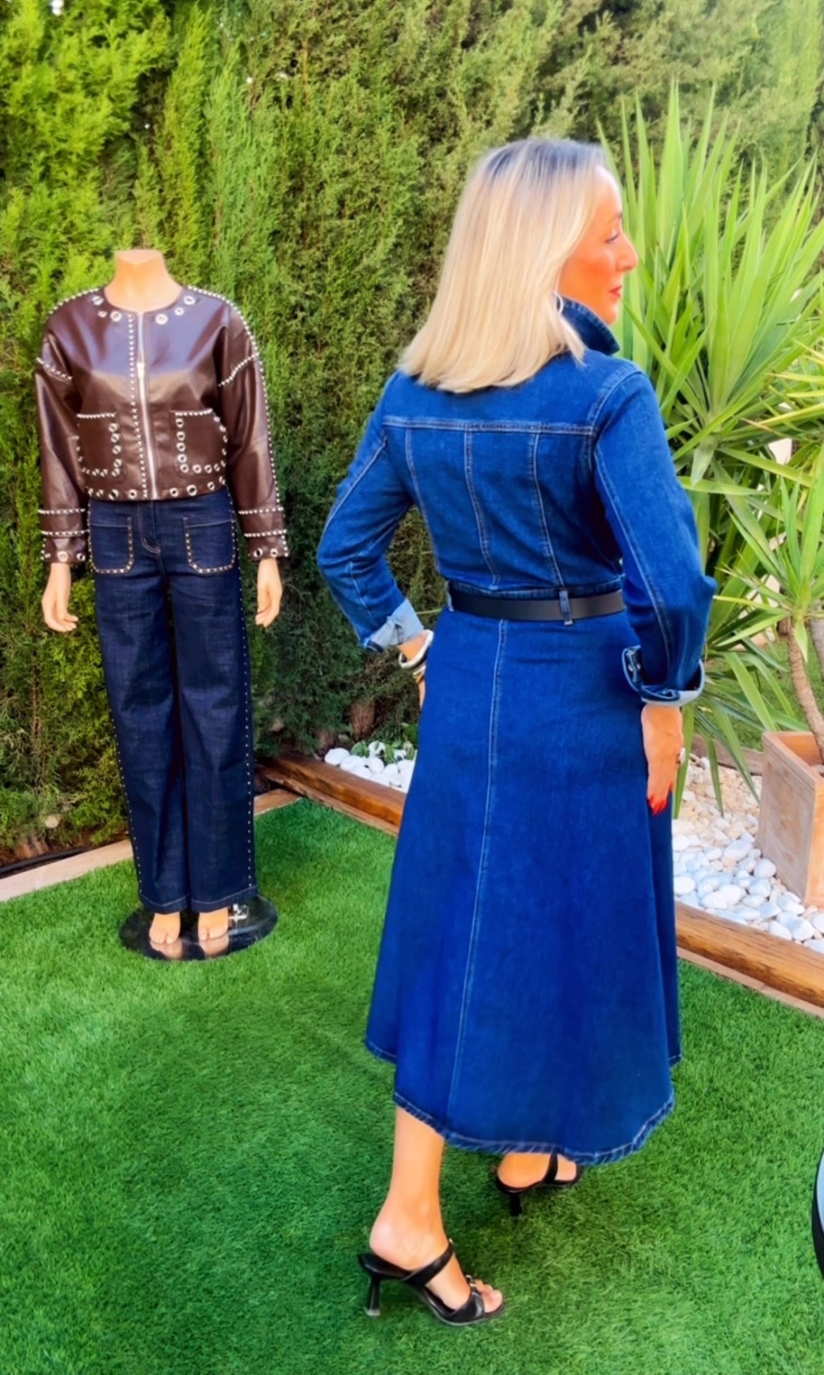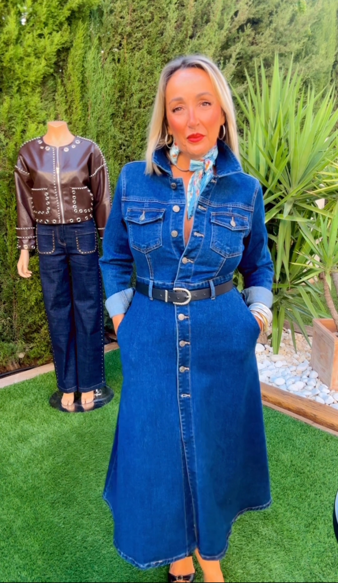 Vestido Vaquero, manga larga acabada en abertura y botones. Bolsillos con solapa en delantero. Cierre frontal con botones.