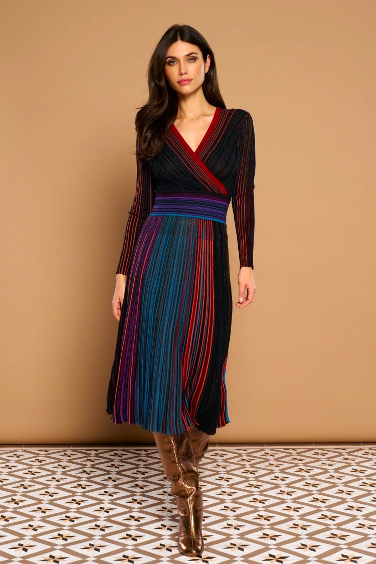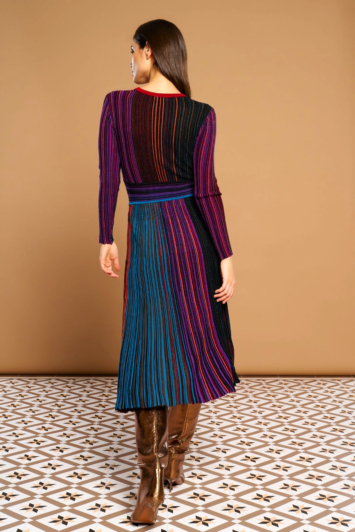 Vestido largo de escote en pico y manga larga. Ajustado en cintura. Falda con vuelo. Tejido elástico.
