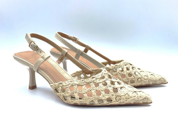 Zapato de tacón, Abierto de talón y Punta Cerrada, Pala Trenzada, Fabricado en PoliPiel. Cierre mediante tira al talón, con hebilla en la parte exterior.